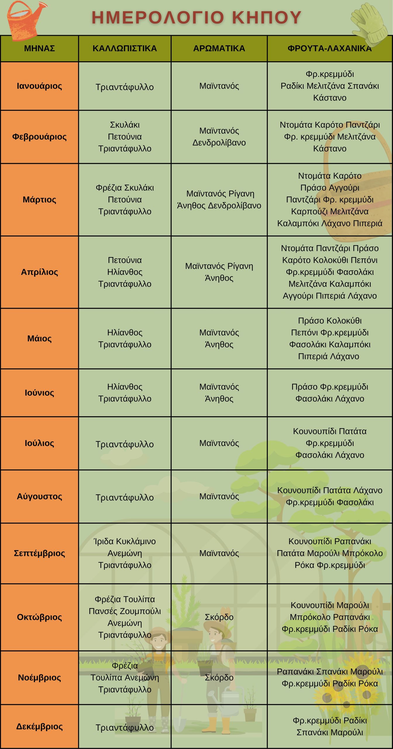 Στη συνέχεια σας παρουσιάζουμε έναν συγκεντρωτικό Πίνακα με όλα τα φυτά, όλων των Κατηγοριών, που μπορούν να καλλιεργηθούν κάθε μήνα μέσα στη χρονιά!