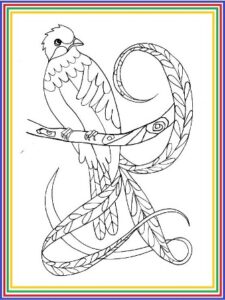 Its tail is very long and reaches approximately 40 centimeters. Its feathers are reddish and yellow, with black spots. It has green feathers on its head and a white line on its neck.