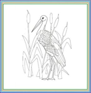 It’s a tall, black and white bird with long red legs and a long, red, pointy beak.
