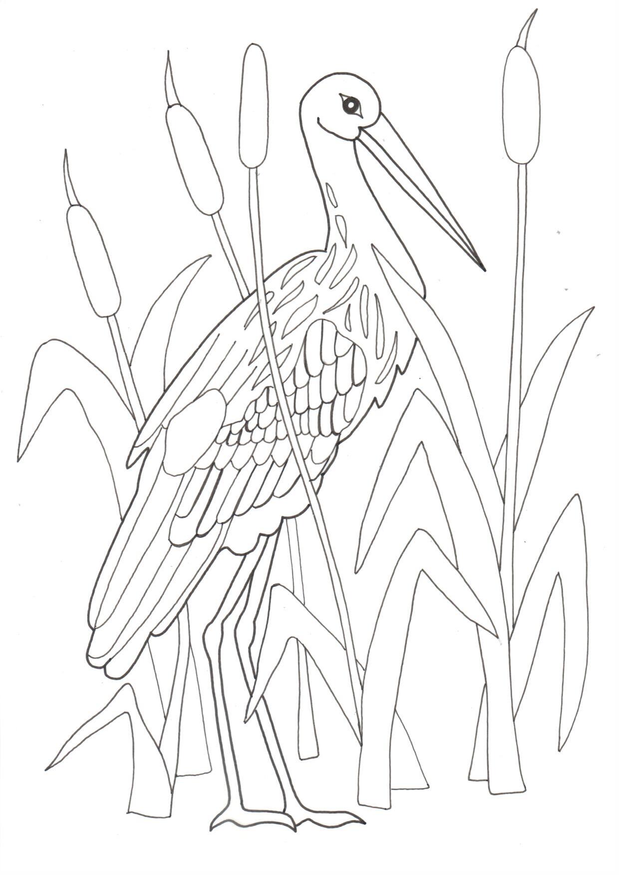 It’s a tall, black and white bird with long red legs and a long, red, pointy beak.