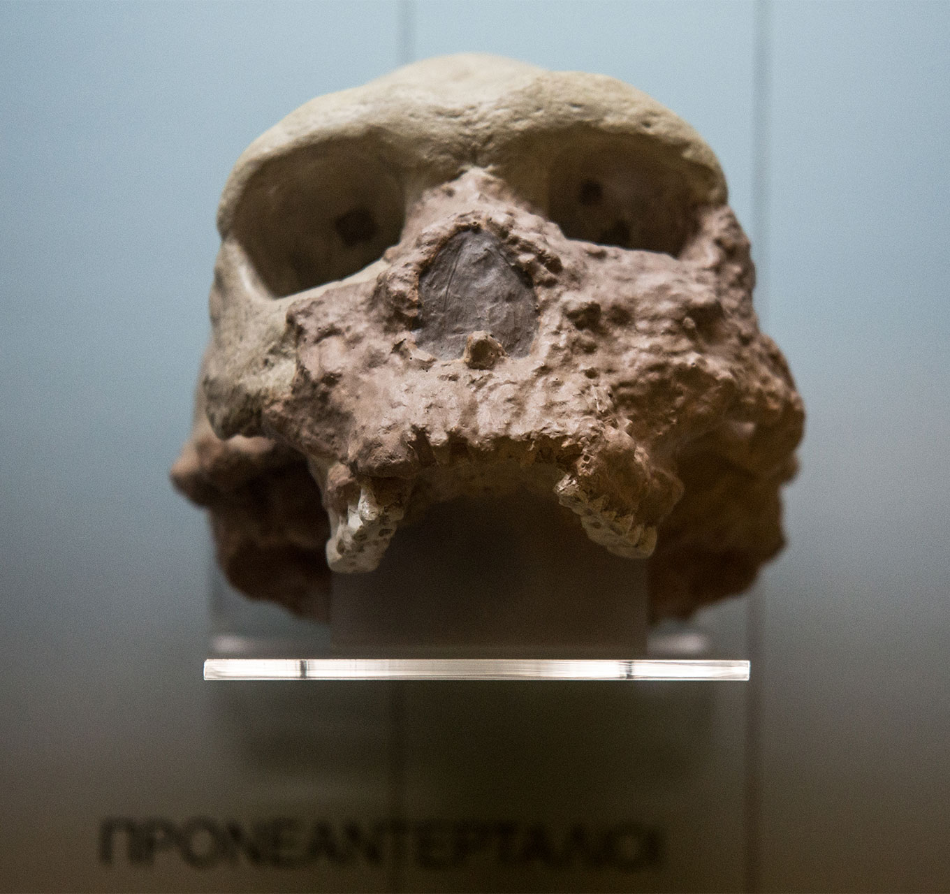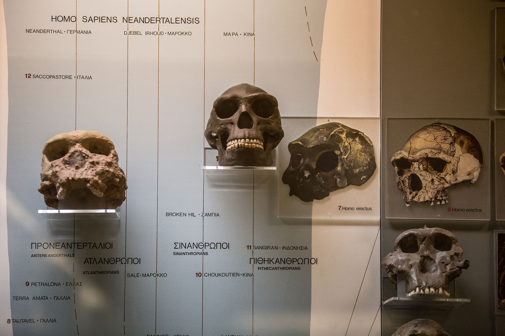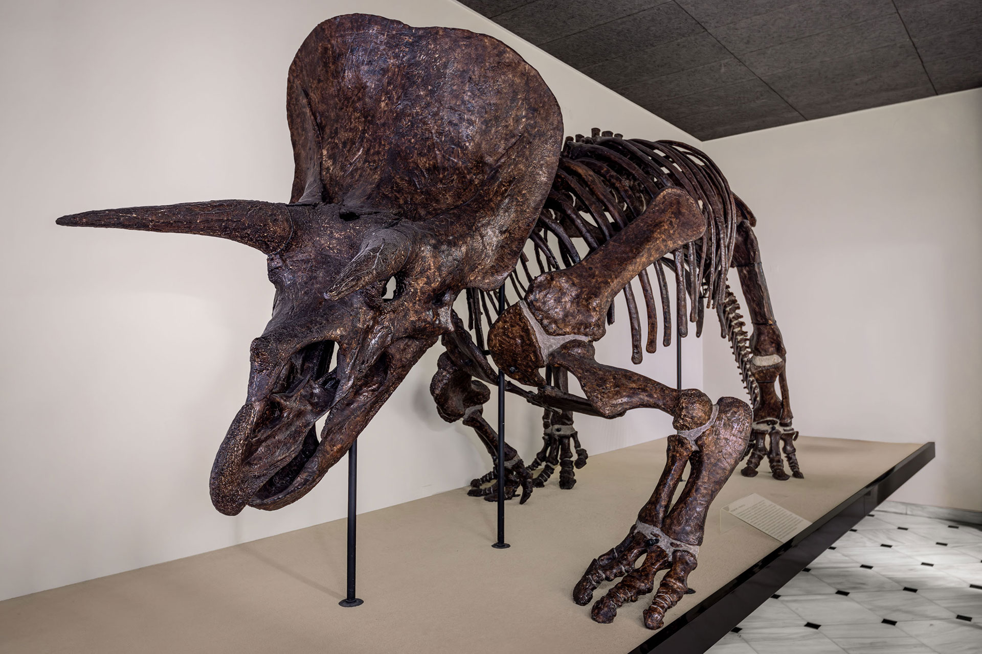 Another display presents two different survival stories: ammonites, which disappeared despite their large size, and nautiluses, which have remained almost unchanged to this day. Among the exhibits stands an impressive 7.16-meter Triceratops skeleton replica, as well as a section on the emergence and evolution of humans, with models, tools, and reconstructions.